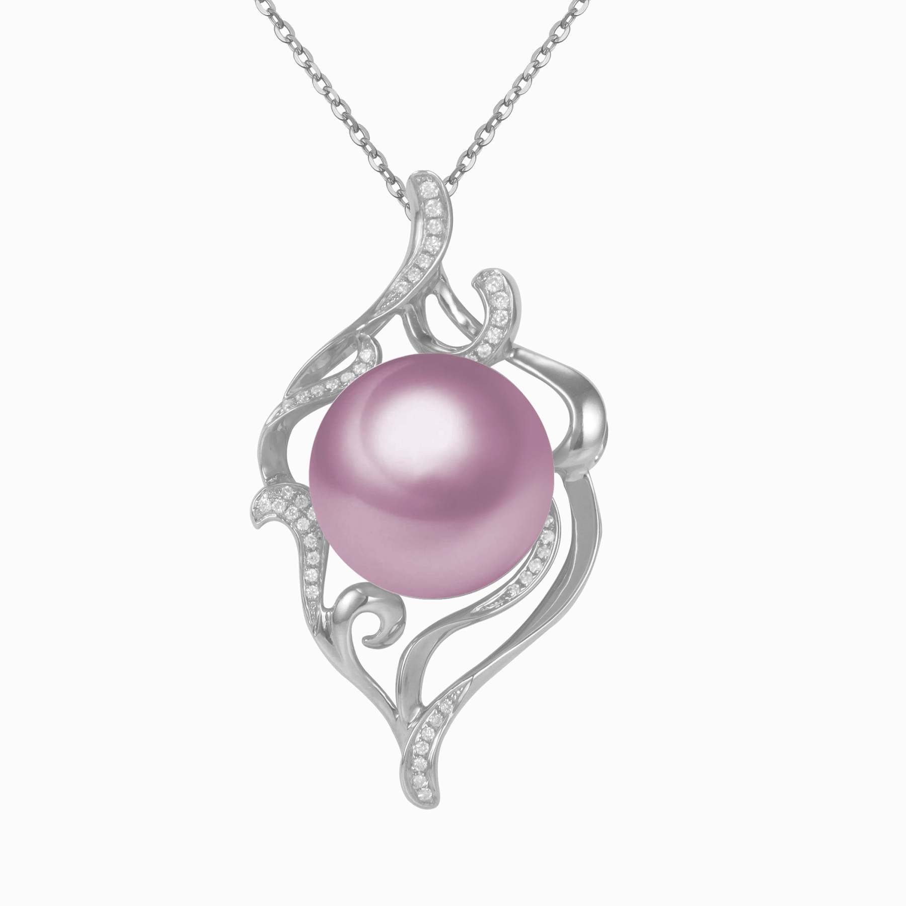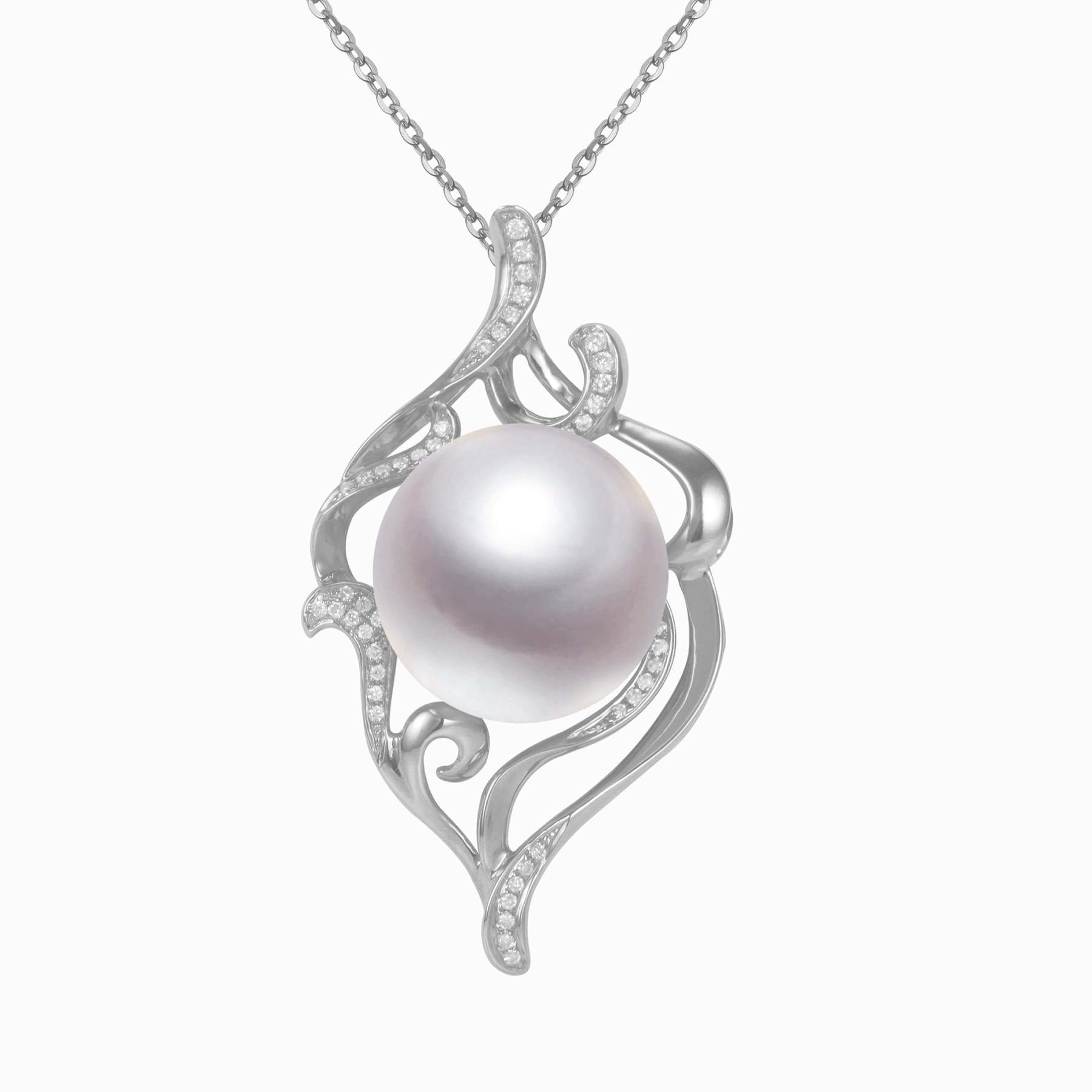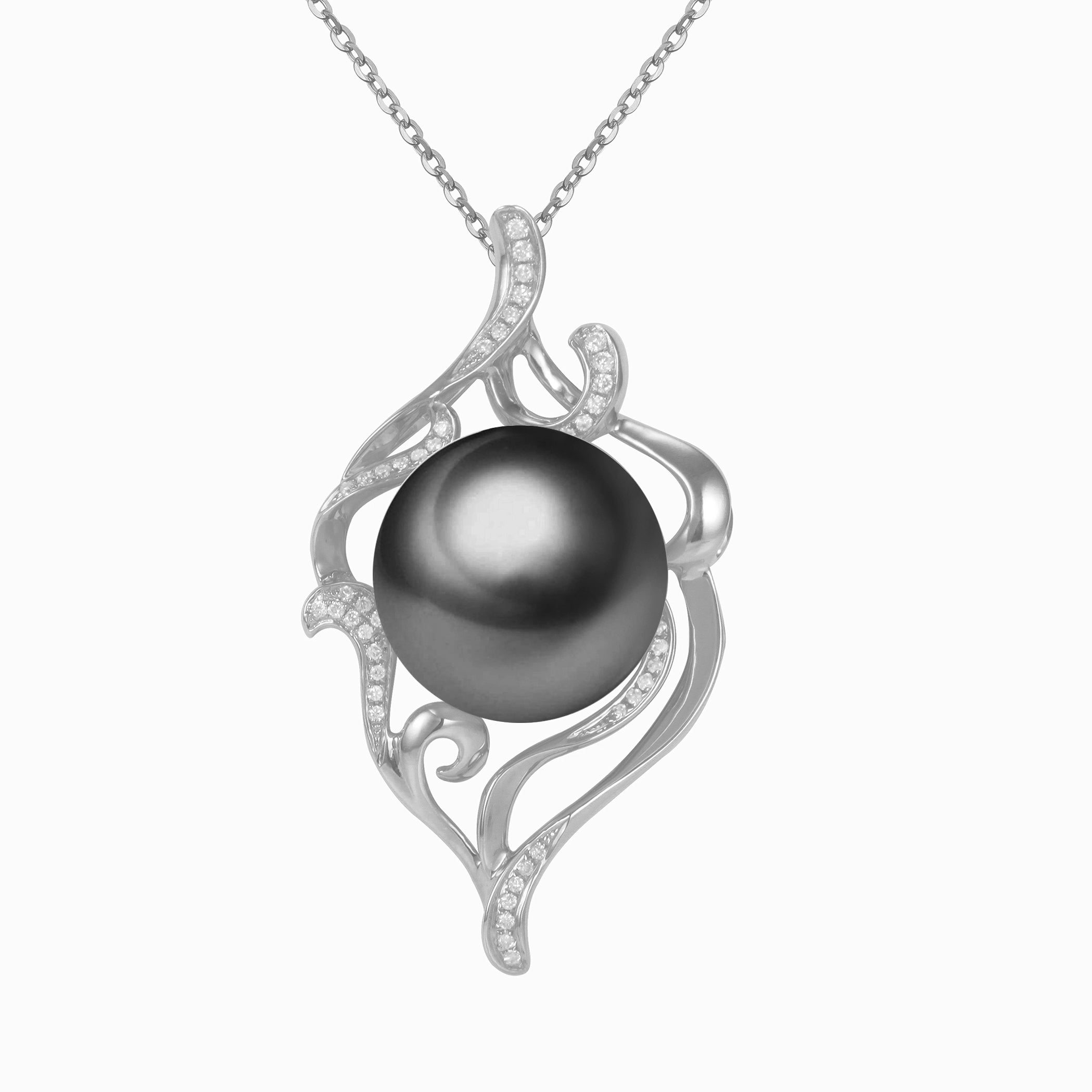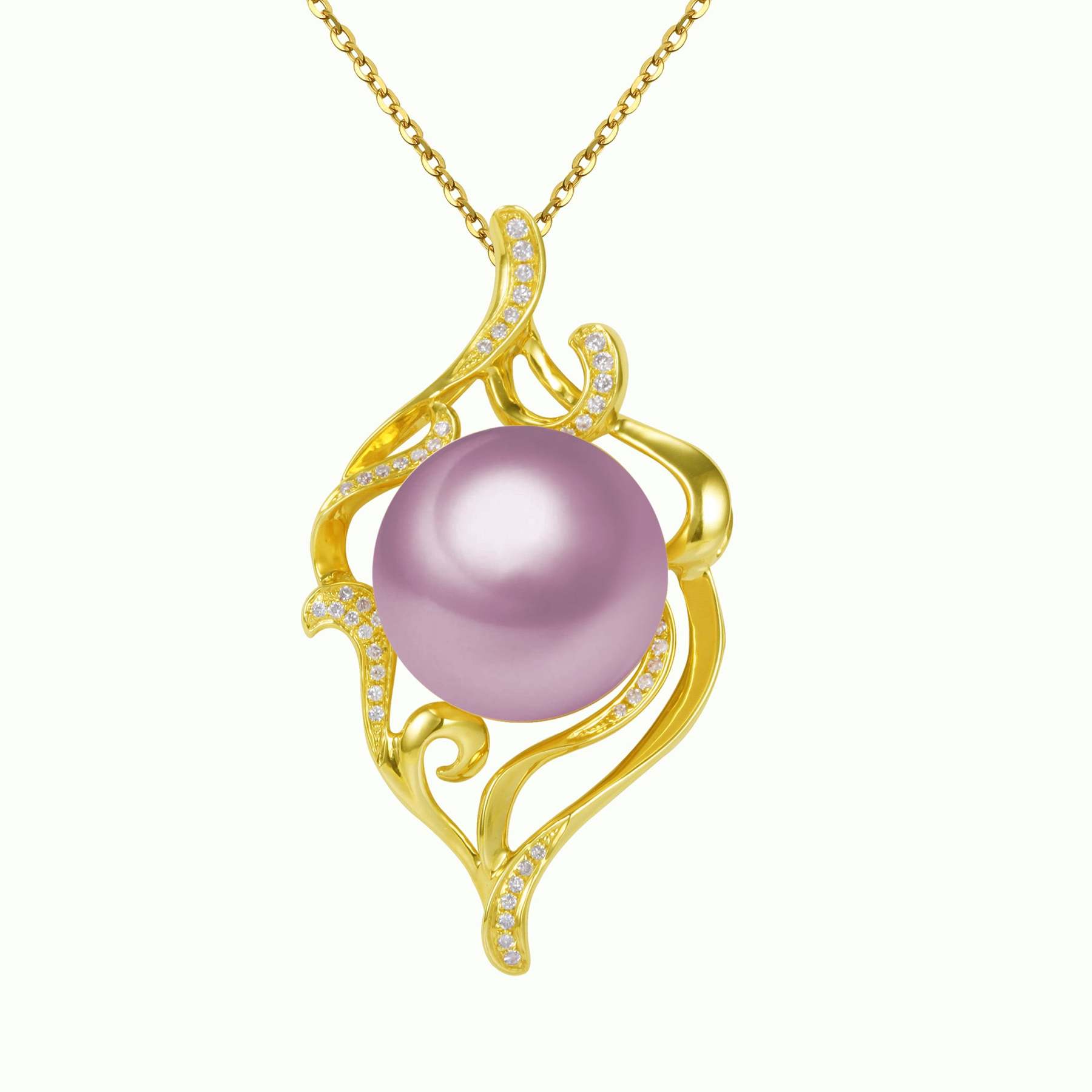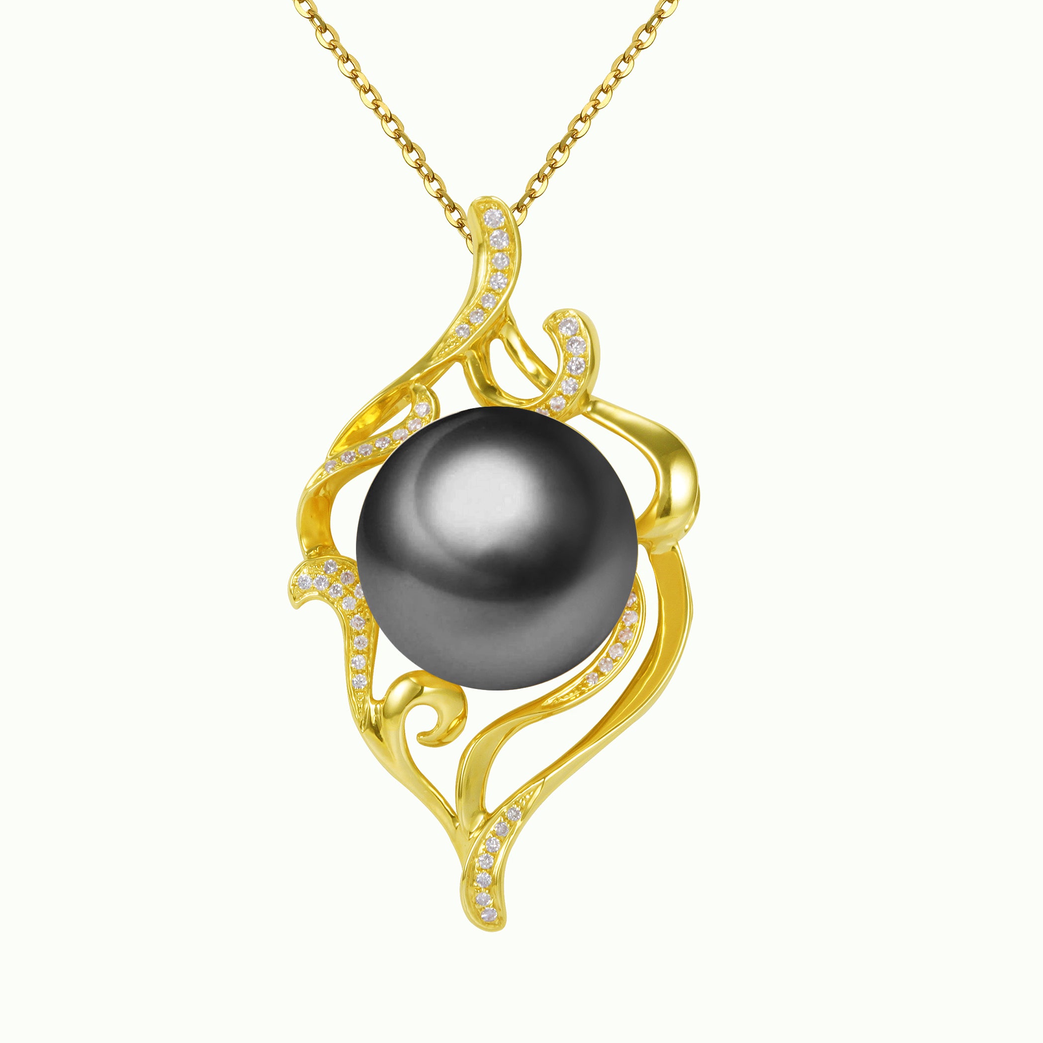 Engulfed in this solid gold and the diamond-encrusted smoke motif is a giant Edison Pearl. This made-to-order design is sure to captivate the wearer and their onlookers.