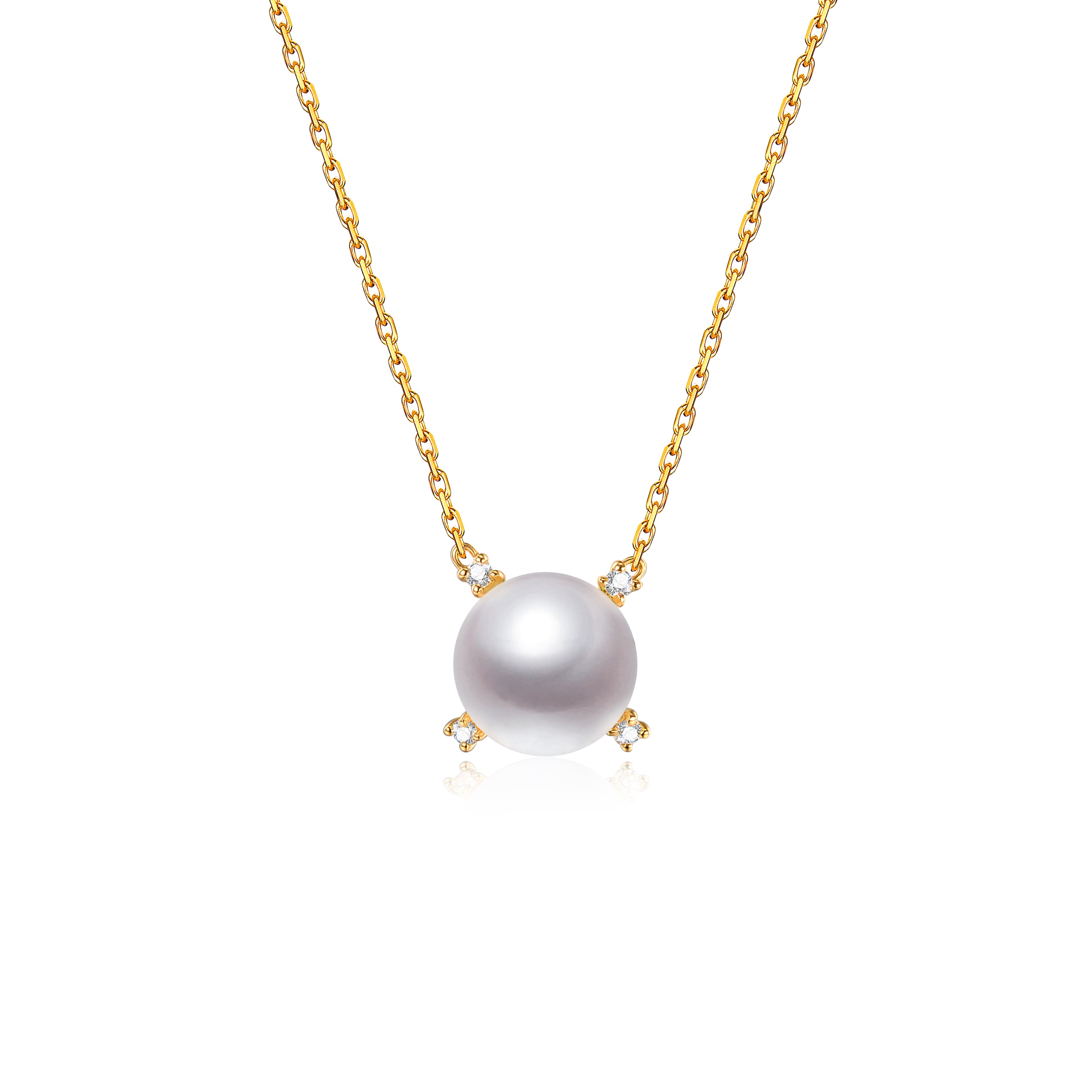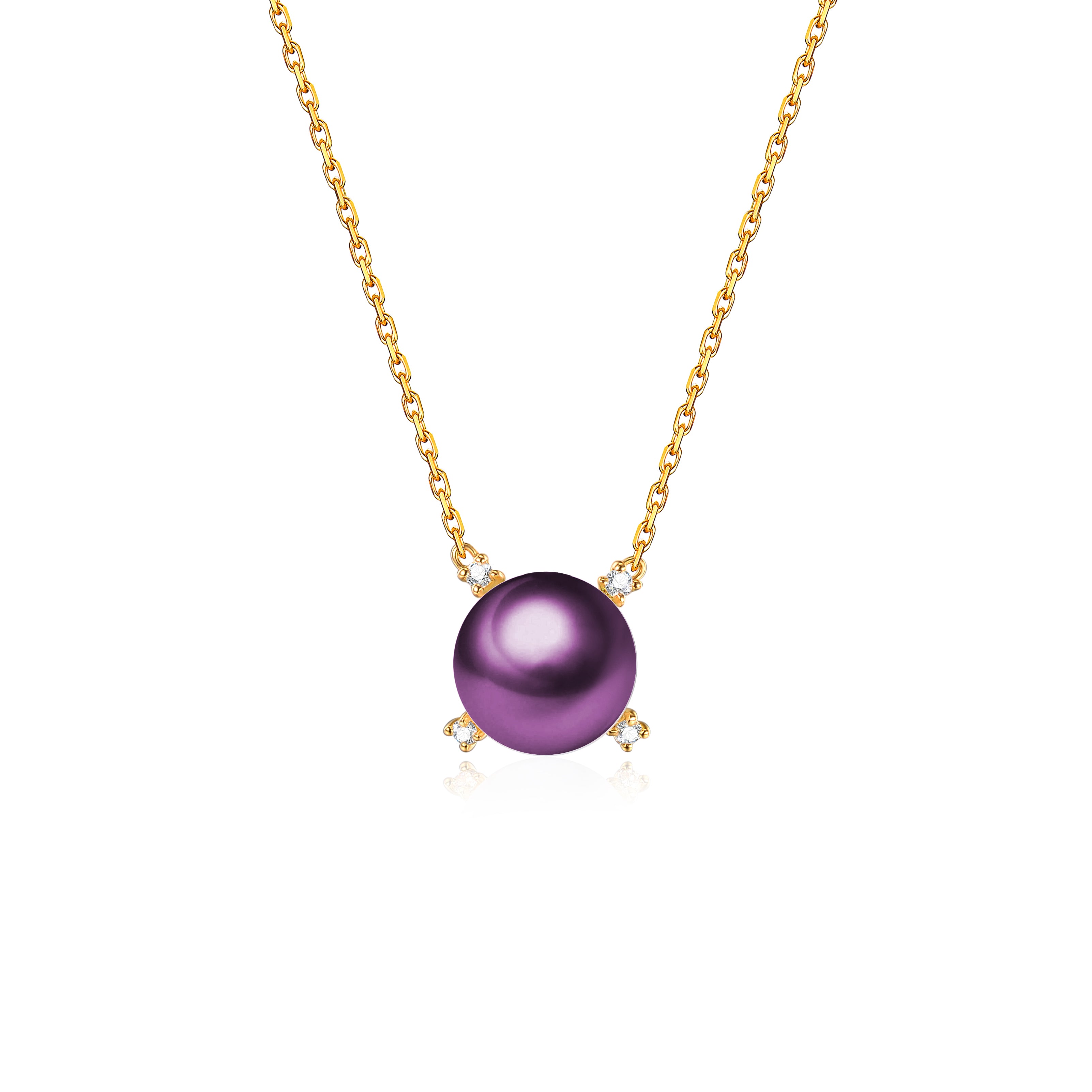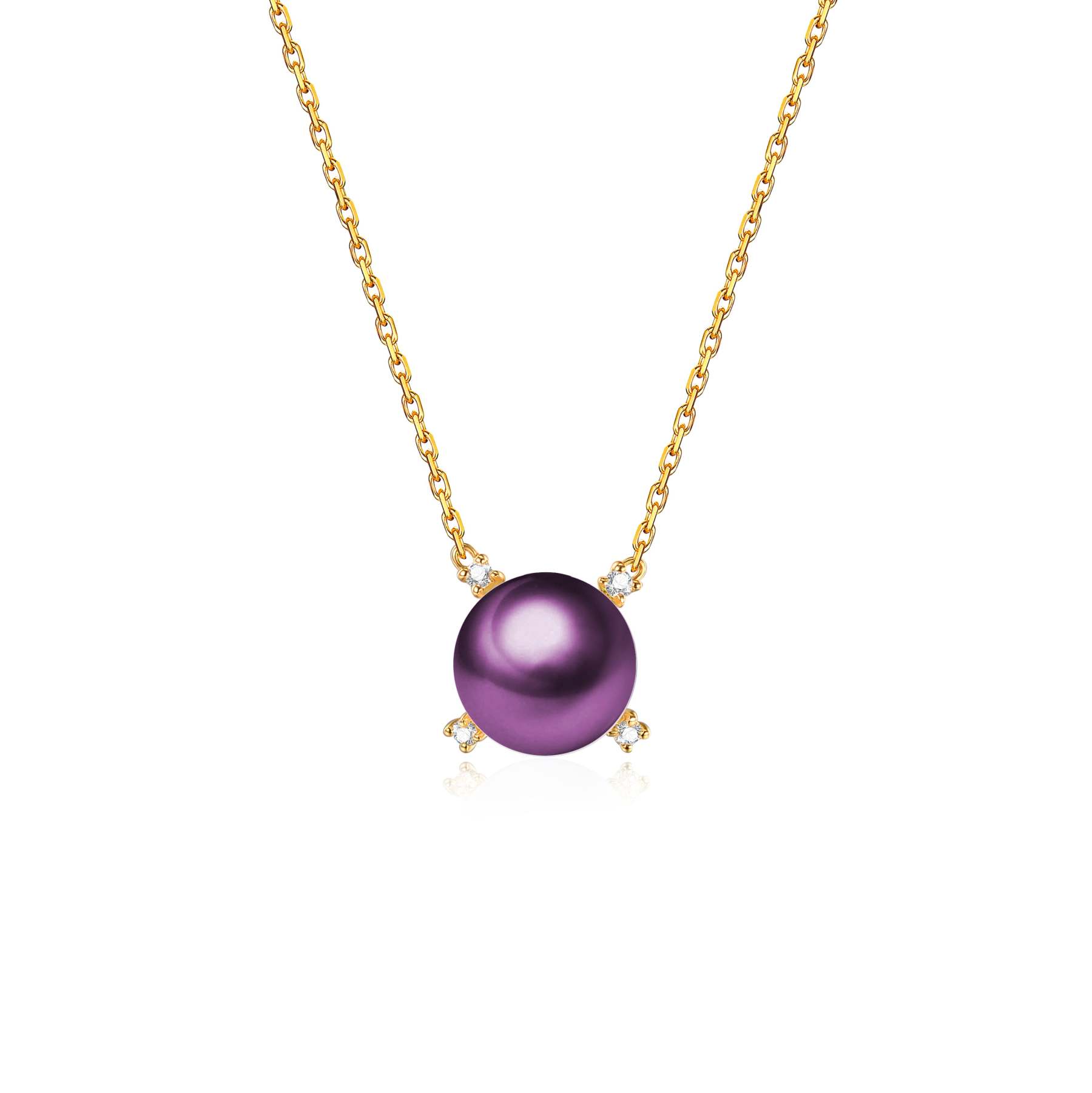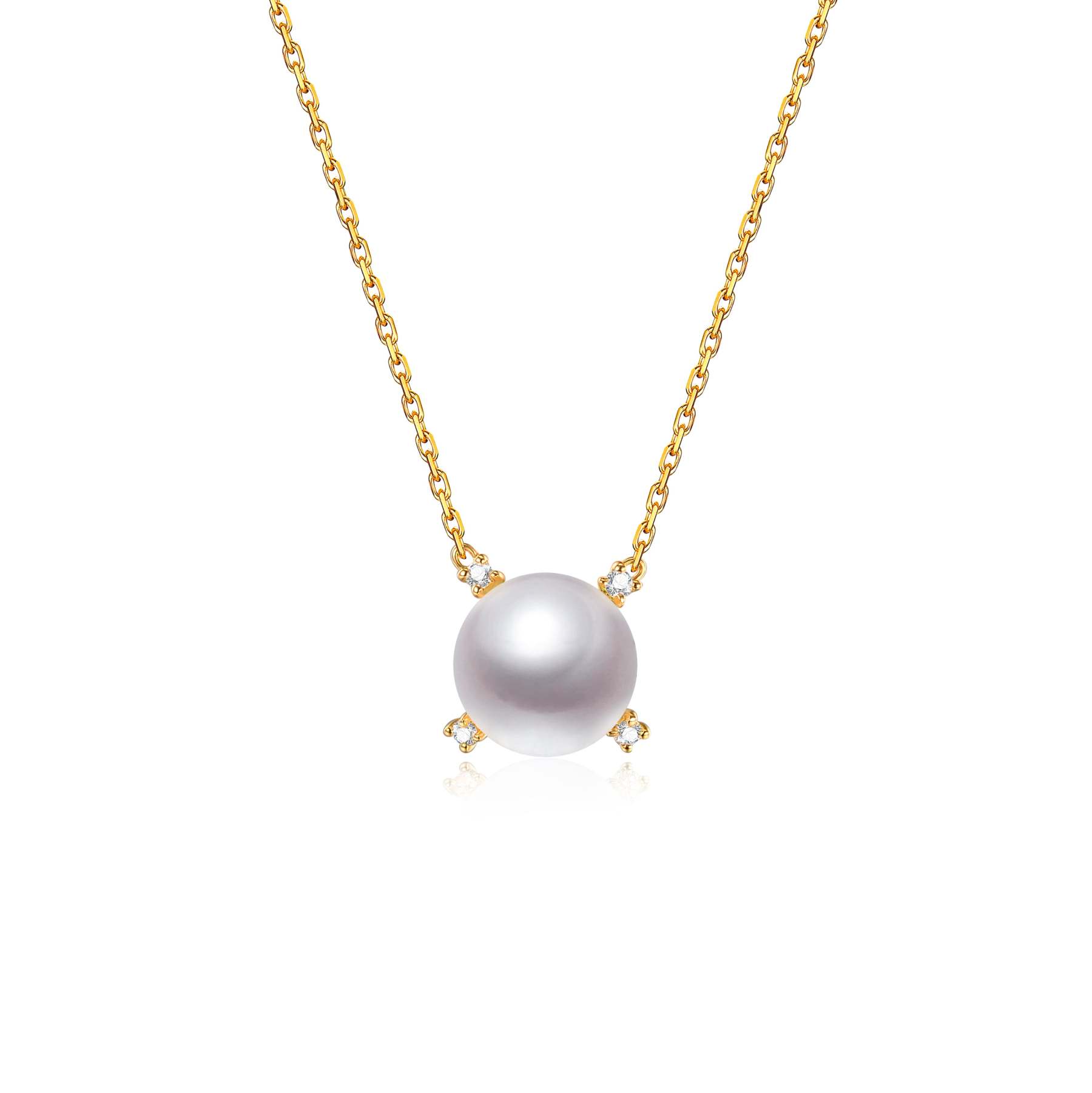 A petite Edison Pearl has its four quadrants each marked with four exquisite diamonds. All on a golden chain that will accentuate the neck of the wearer.